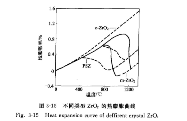 還有一種情況是,因為材料形狀或傳熱特性使其中的溫度分布不均勻(即產(chǎn)生溫度梯度)時產(chǎn)生的應(yīng)力。熱膨脹行為是影響材料抗熱震極其重要的因素,根據(jù)熱膨脹理論可對材料的熱膨脹行為進行設(shè)計和調(diào)整,特別是對氧化鋯的熱膨脹系數(shù)的大小和穩(wěn)定劑的種類和添加量有一定的關(guān)系。這對考察它的抗熱震性有重要的意義。圖3-15[13]給出了純單斜、部分穩(wěn)定及立方氧化鋯的熱膨脹曲線。