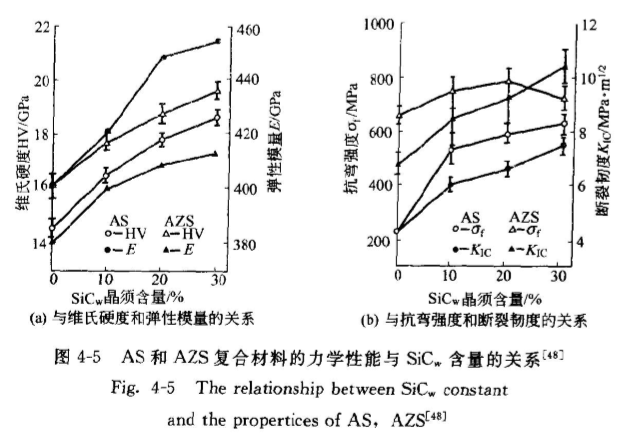 加入30%(體積分?jǐn)?shù))SiC、可使可從純Al1O的235MPa提高到634MPa。加入20%(體積分?jǐn)?shù))2Y-ZrO2顆??蛇M(jìn)一步提高AS材料的抗彎強(qiáng)度,但此時(shí)SiCw的補(bǔ)強(qiáng)作用則遠(yuǎn)低于在AS材料中,而且在SiC、含量為20%(體積分?jǐn)?shù))時(shí)AZS材料的0達(dá)達(dá)最高值784MPa,隨隨后進(jìn)一步提高晶須含量反而下降A(chǔ)S和AZS材料料的斷裂韌度均隨SiC含量的增加而連續(xù)提高,并且AZS材料度Kc的提高幅度略大于AS材材料。