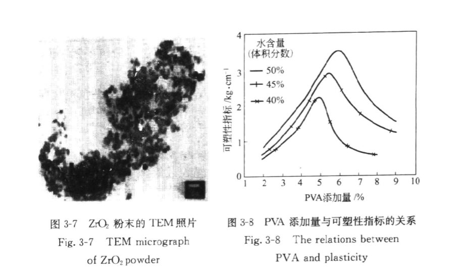 當PVA在ZrO2表面的吸附量達到飽和時,可塑性指標達到最大。若繼續增加PVA,它不再吸附ZrO2顆粒而是自身成膜。因PVA膜膜很容易受剪應力而破壞,破壞的PVA膜因其共價鍵的方向性不易重組,導致顆粒間的結合力下降,所以PVA過多反而使可塑性下降。